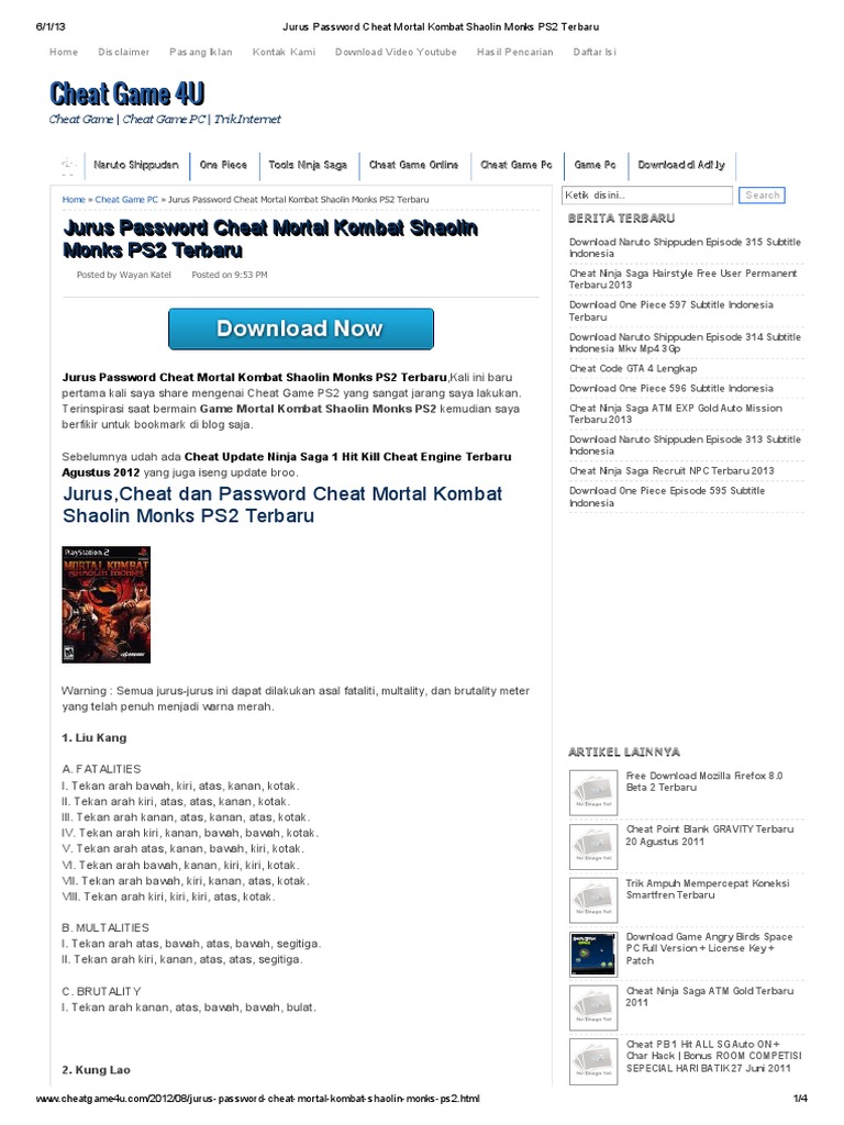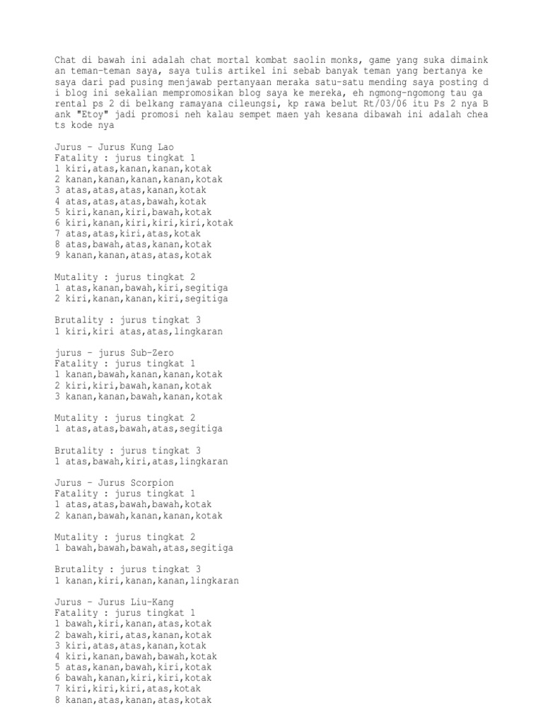 - Cheat Dan Jurus Mortal Kombat Shaolin Monks Lengkap . Cheat Yang Jaka Kasih Di Artikel Ini Udah Dites Sebelumnya, Jadi Kalian Nggak Perlu Khawatir Kalau Kode Cheatnya Gagal.